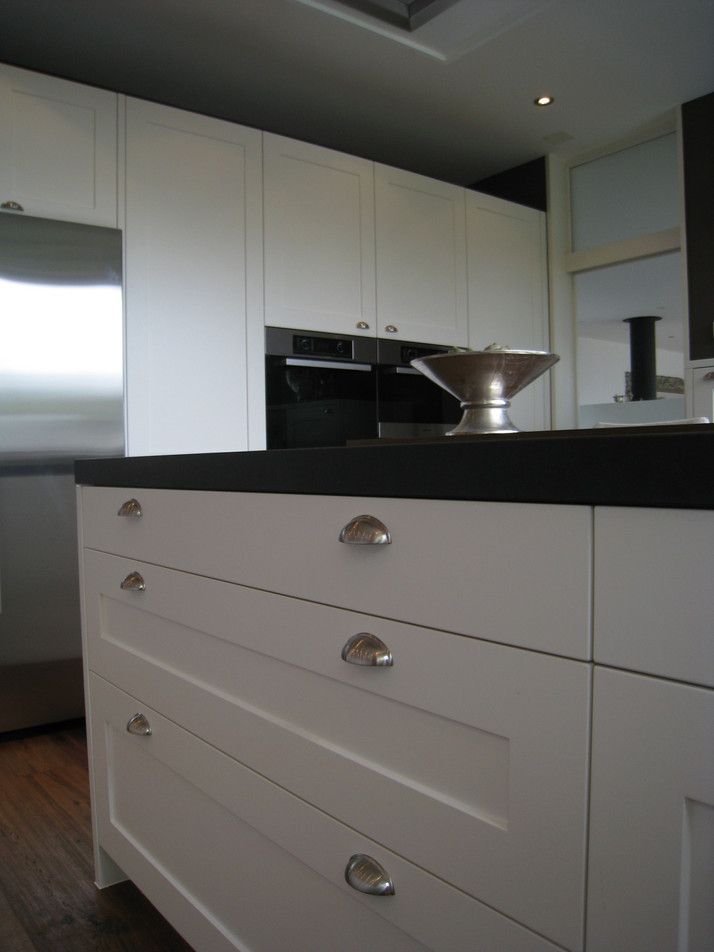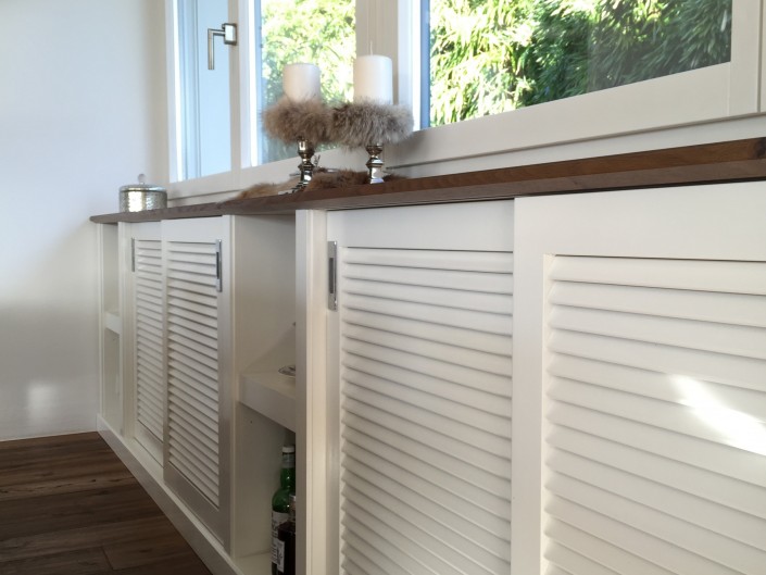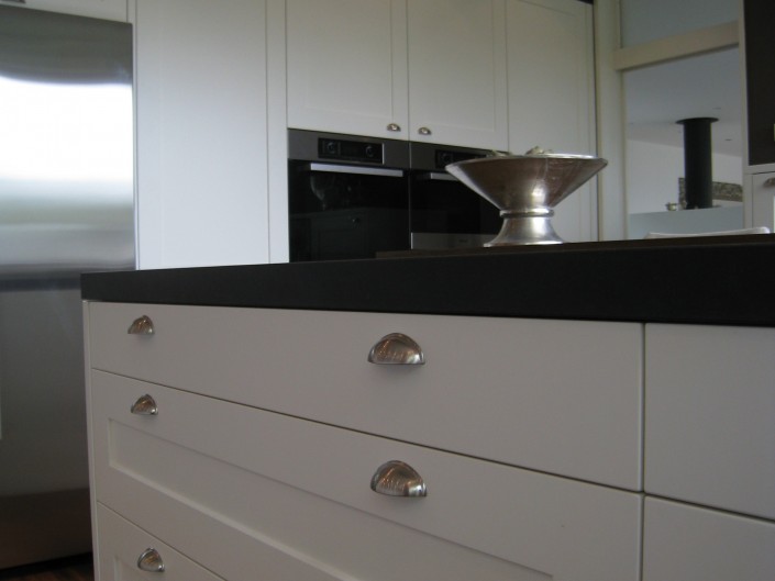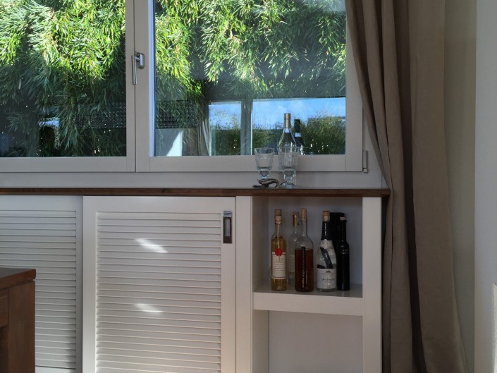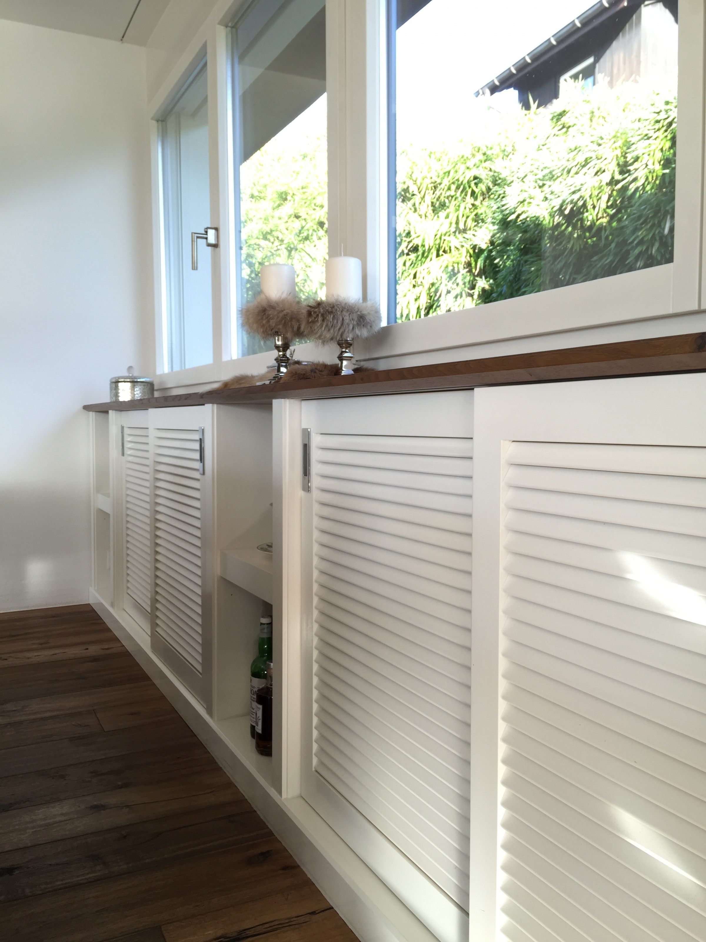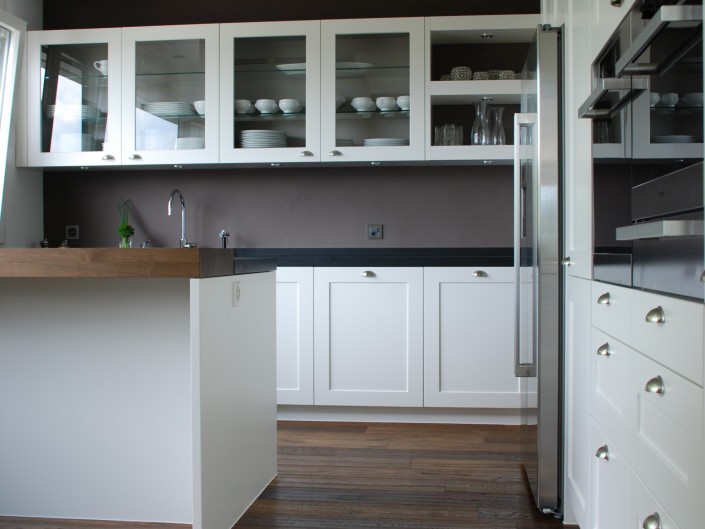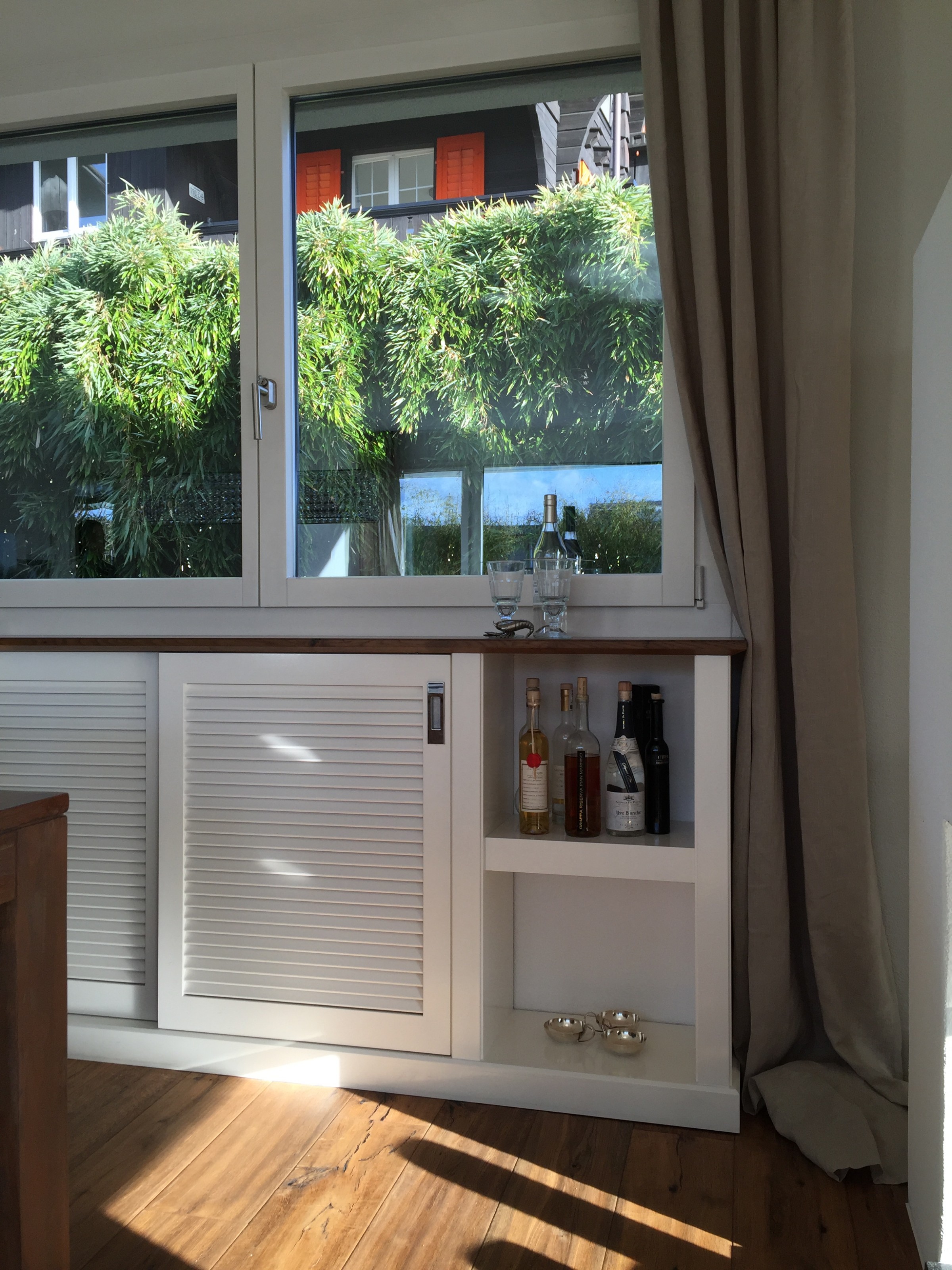 Teilrenovation und Neugestaltung Entrée, Wohnzimmer, Küche und Elternbad Material: Granit Nero assoluto satiniert, MDF Schleiflack, Eichenholz. Badmöbel aus Kalksandstein, Lamellentüren aus MDF Schleiflack