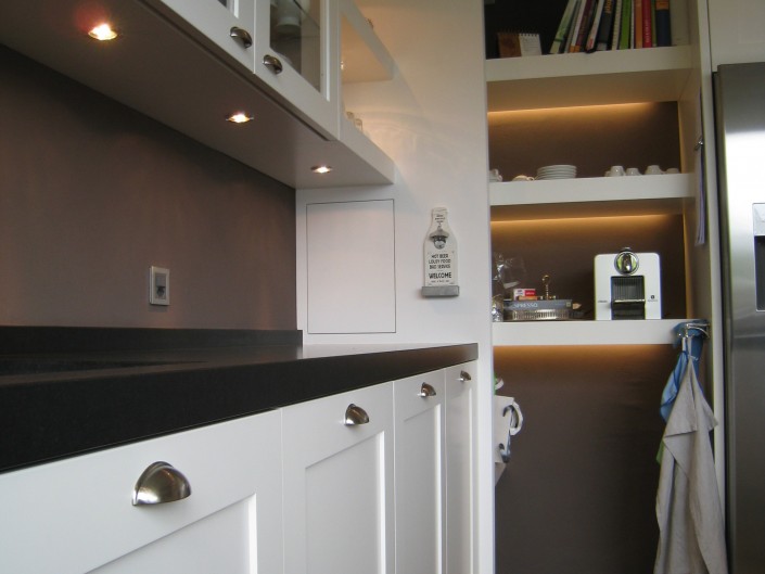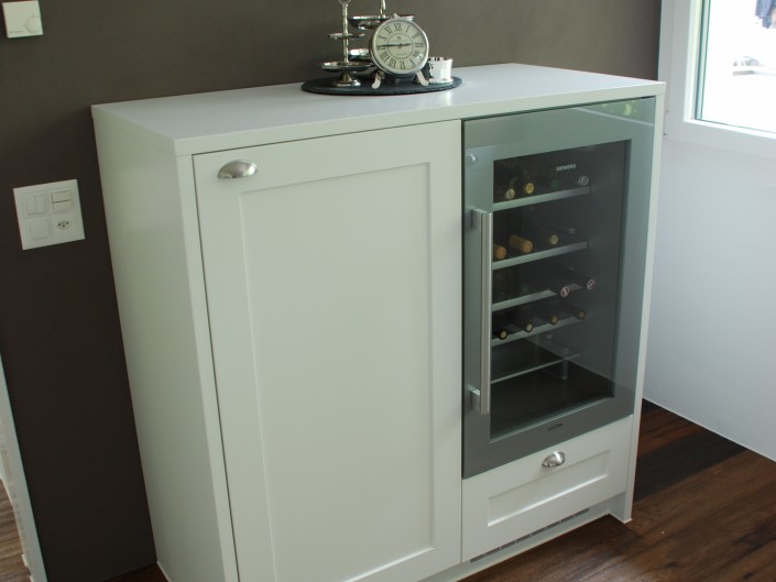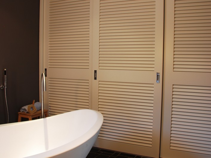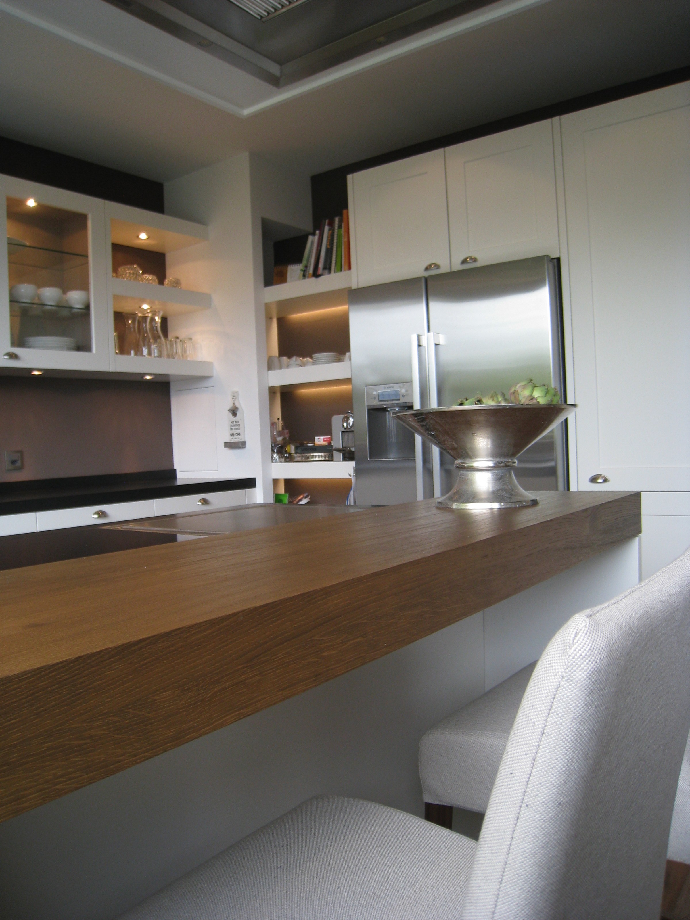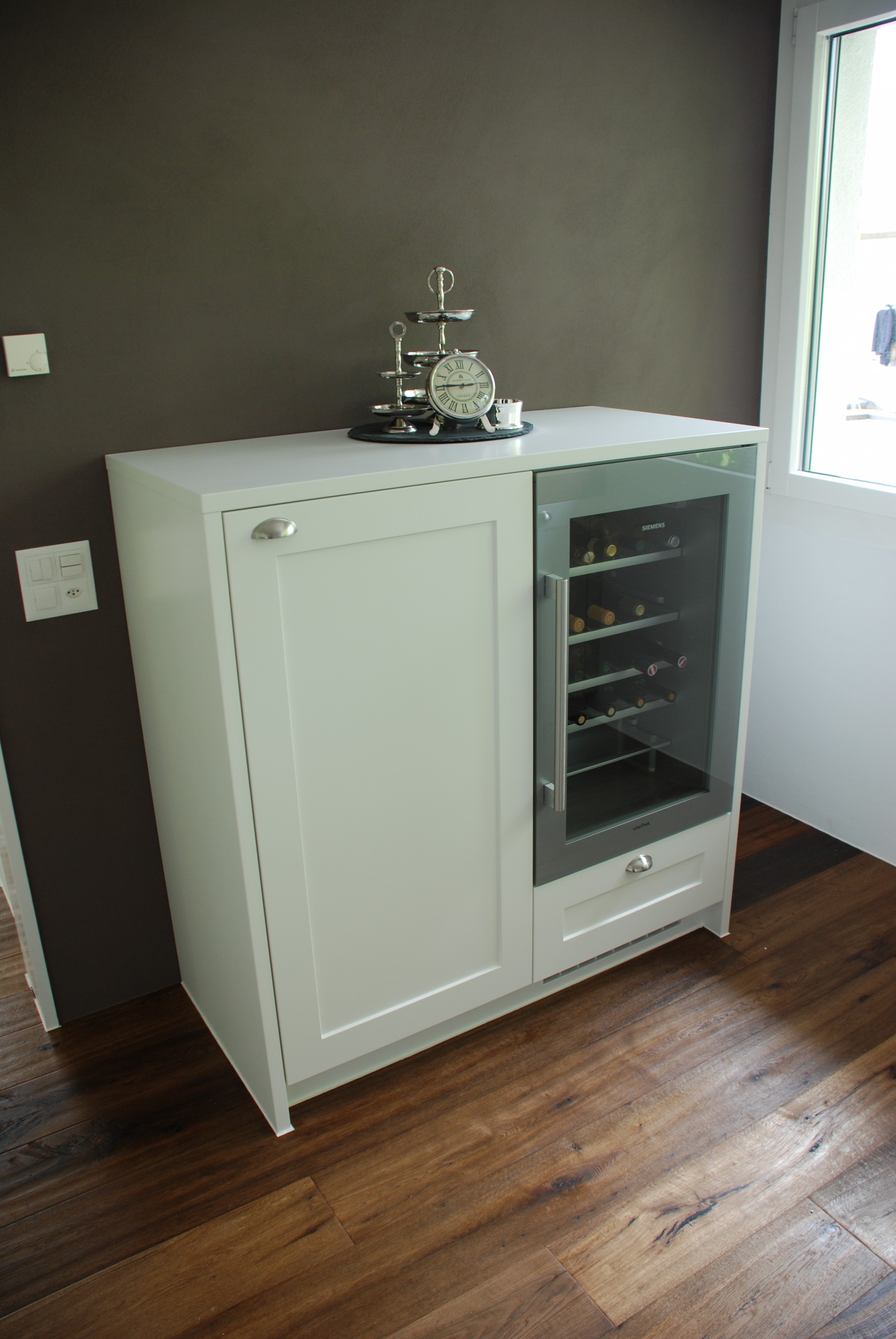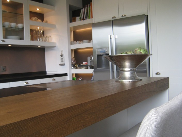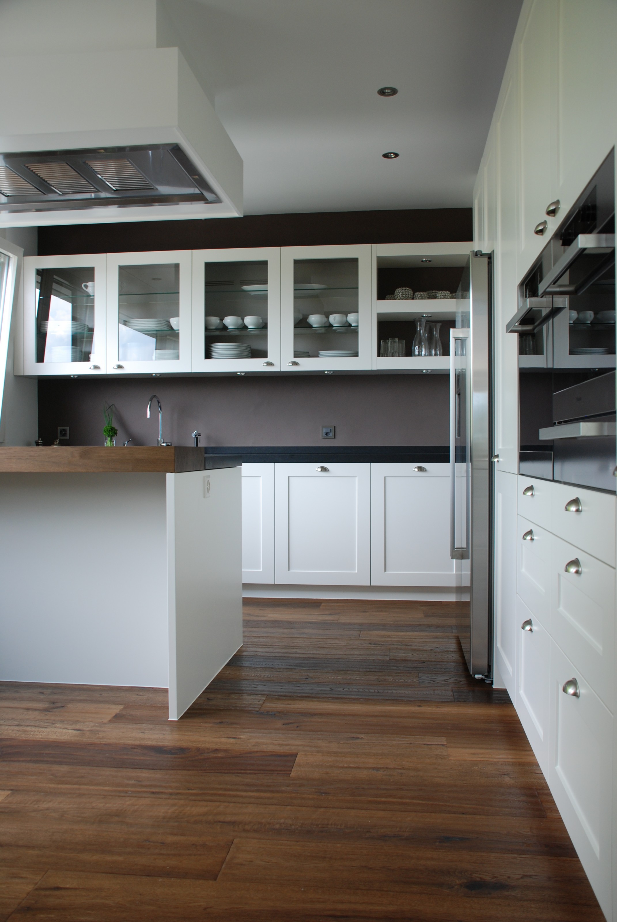 Teilrenovation und Neugestaltung Entrée, Wohnzimmer, Küche und Elternbad Material: Granit Nero assoluto satiniert, MDF Schleiflack, Eichenholz. Badmöbel aus Kalksandstein, Lamellentüren aus MDF Schleiflack