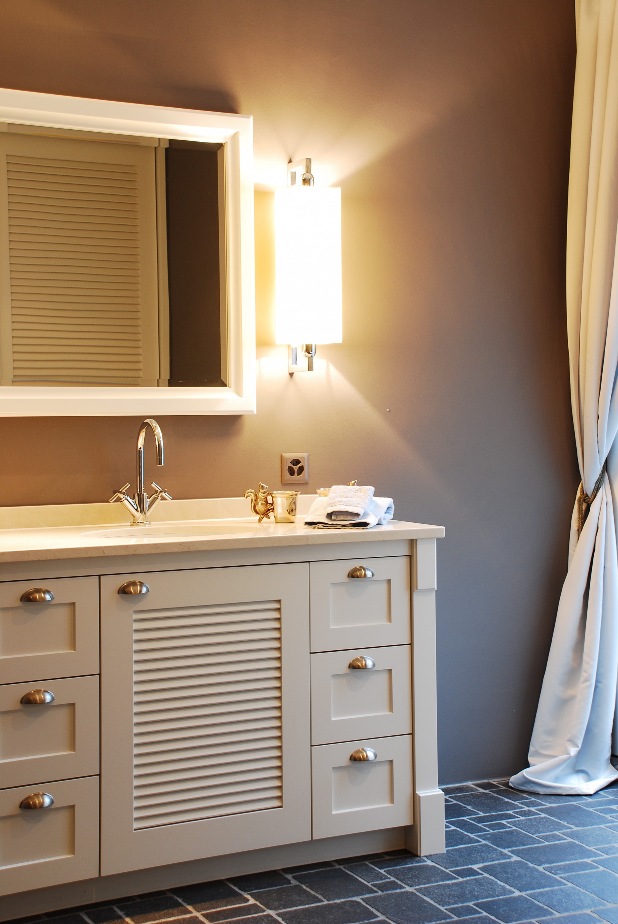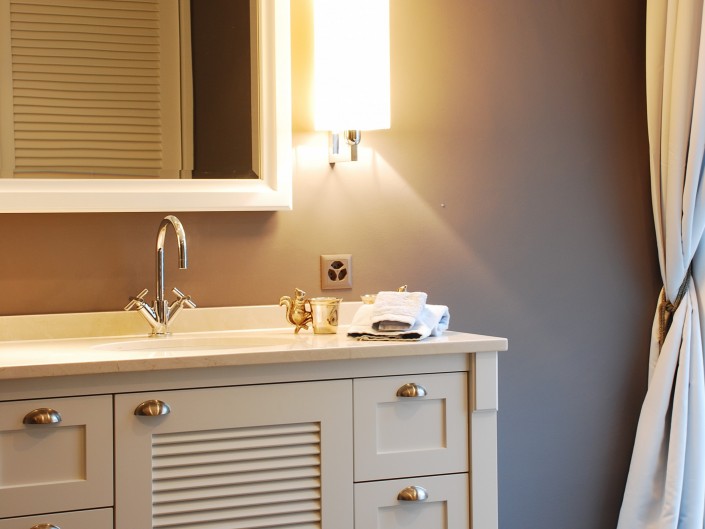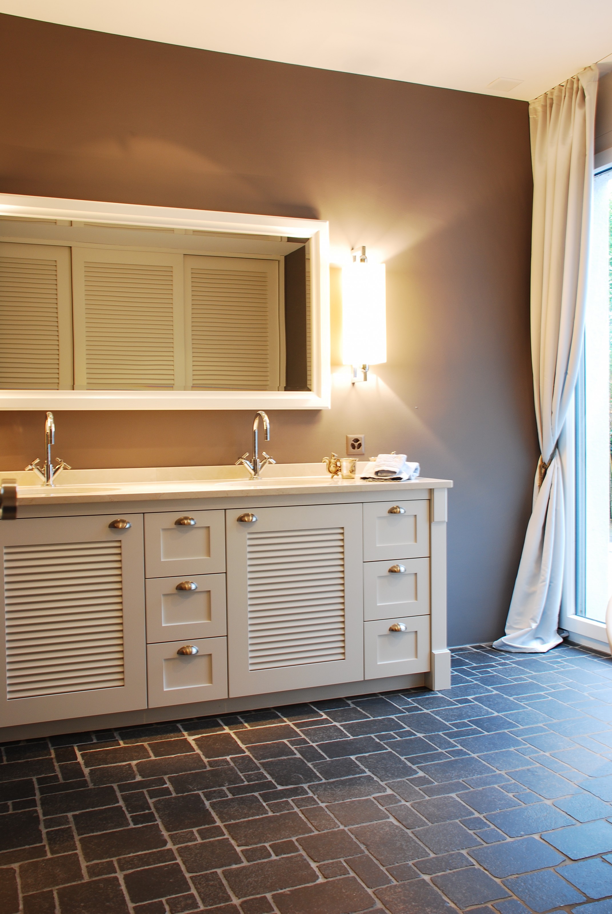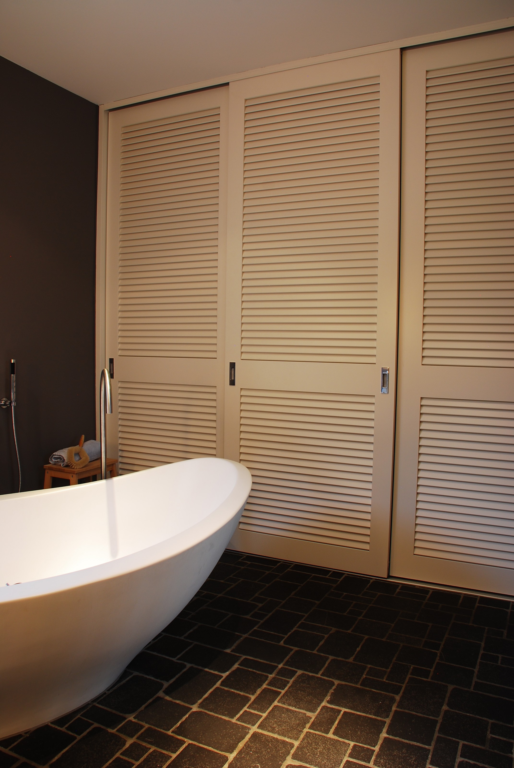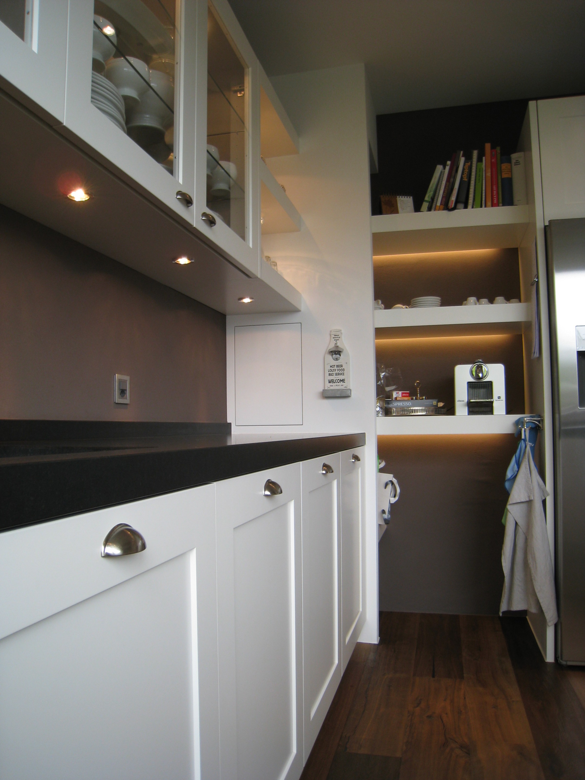 Teilrenovation und Neugestaltung Entrée, Wohnzimmer, Küche und Elternbad Material: Granit Nero assoluto satiniert, MDF Schleiflack, Eichenholz. Badmöbel aus Kalksandstein, Lamellentüren aus MDF Schleiflack