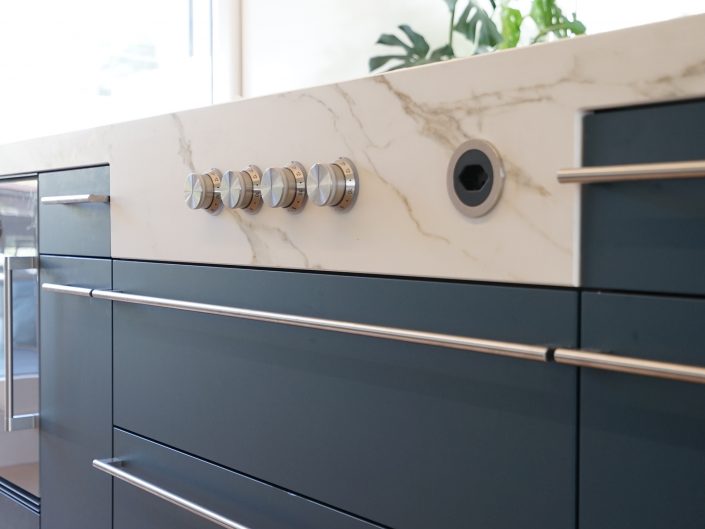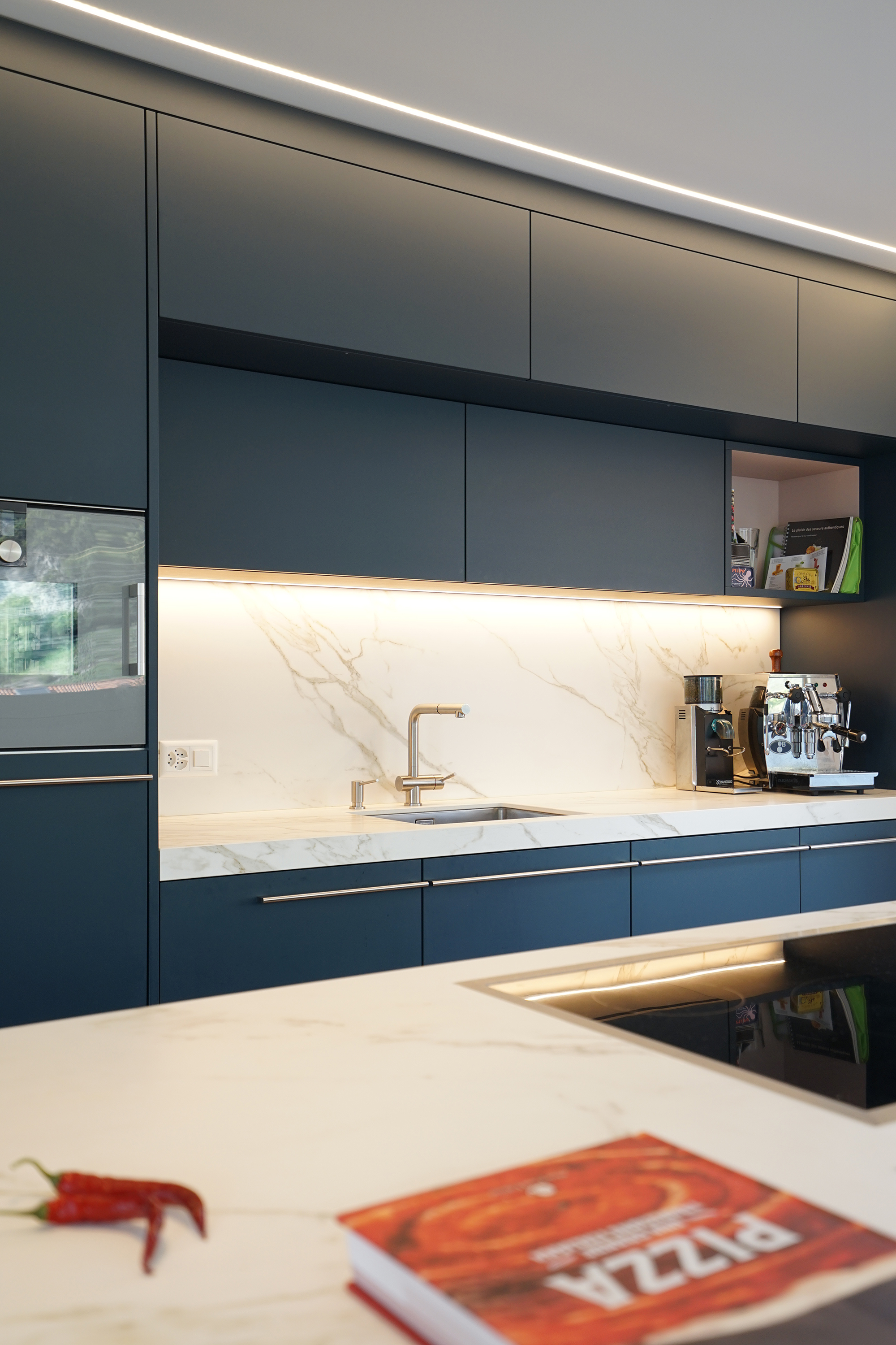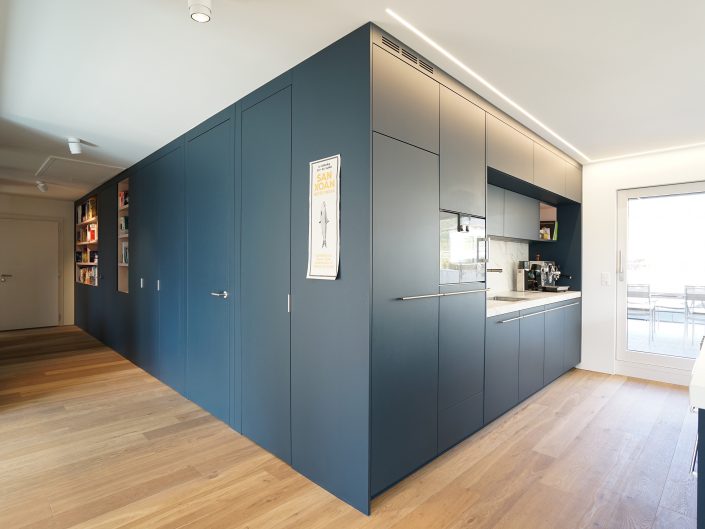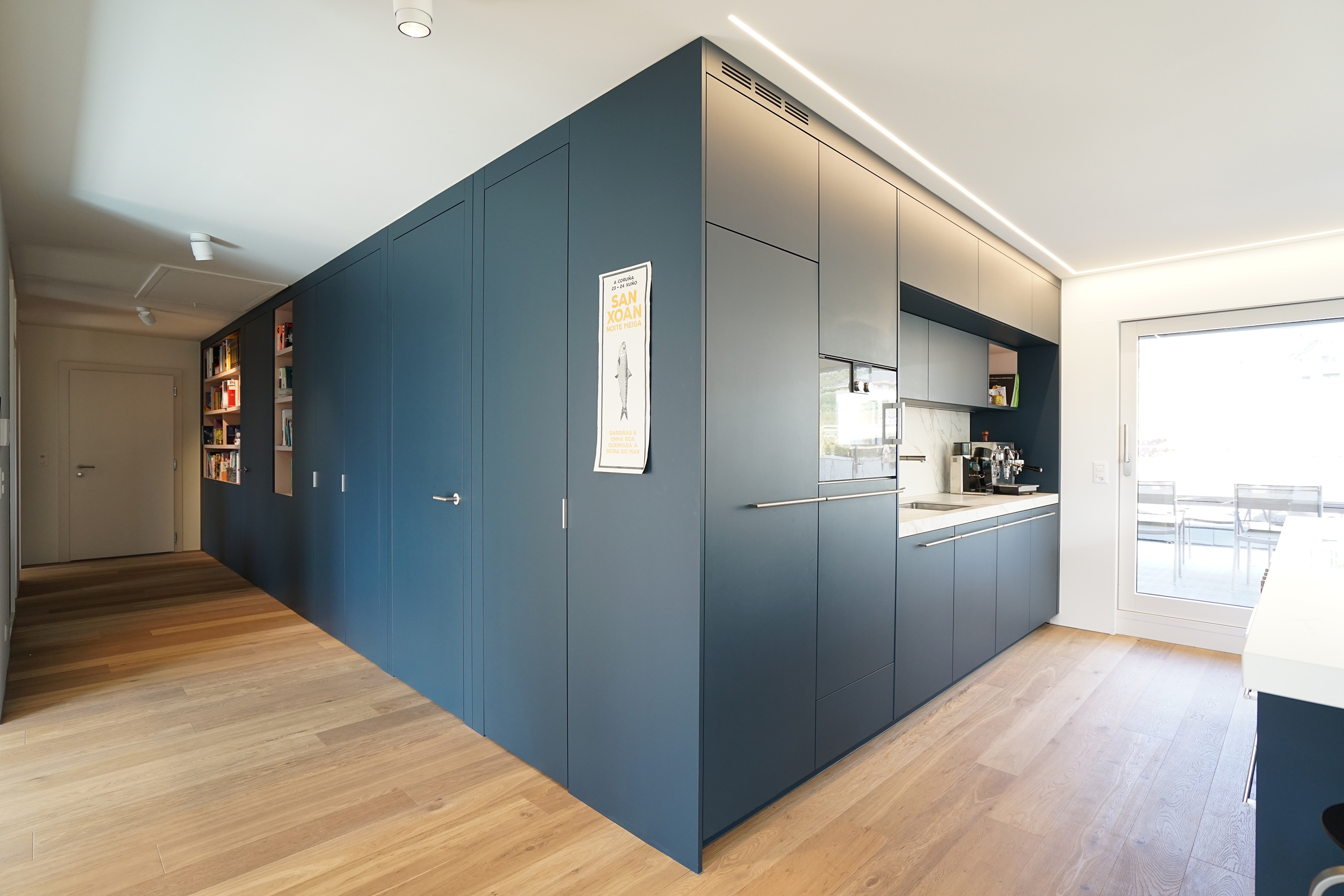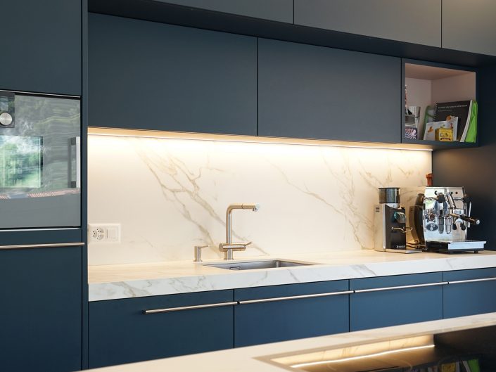 Ausführung von Küche, Entréebereich, Bad, Material: Neolith Estatuario, Strukturlack, Eiche