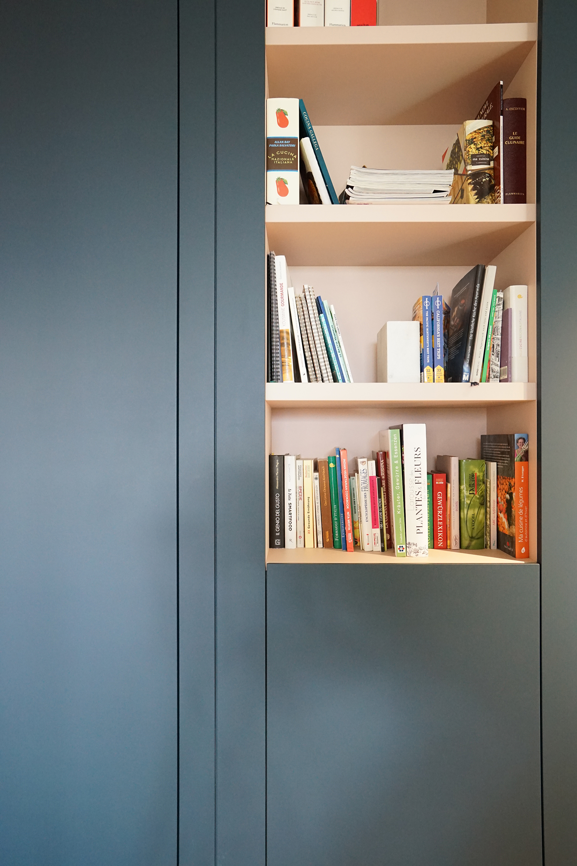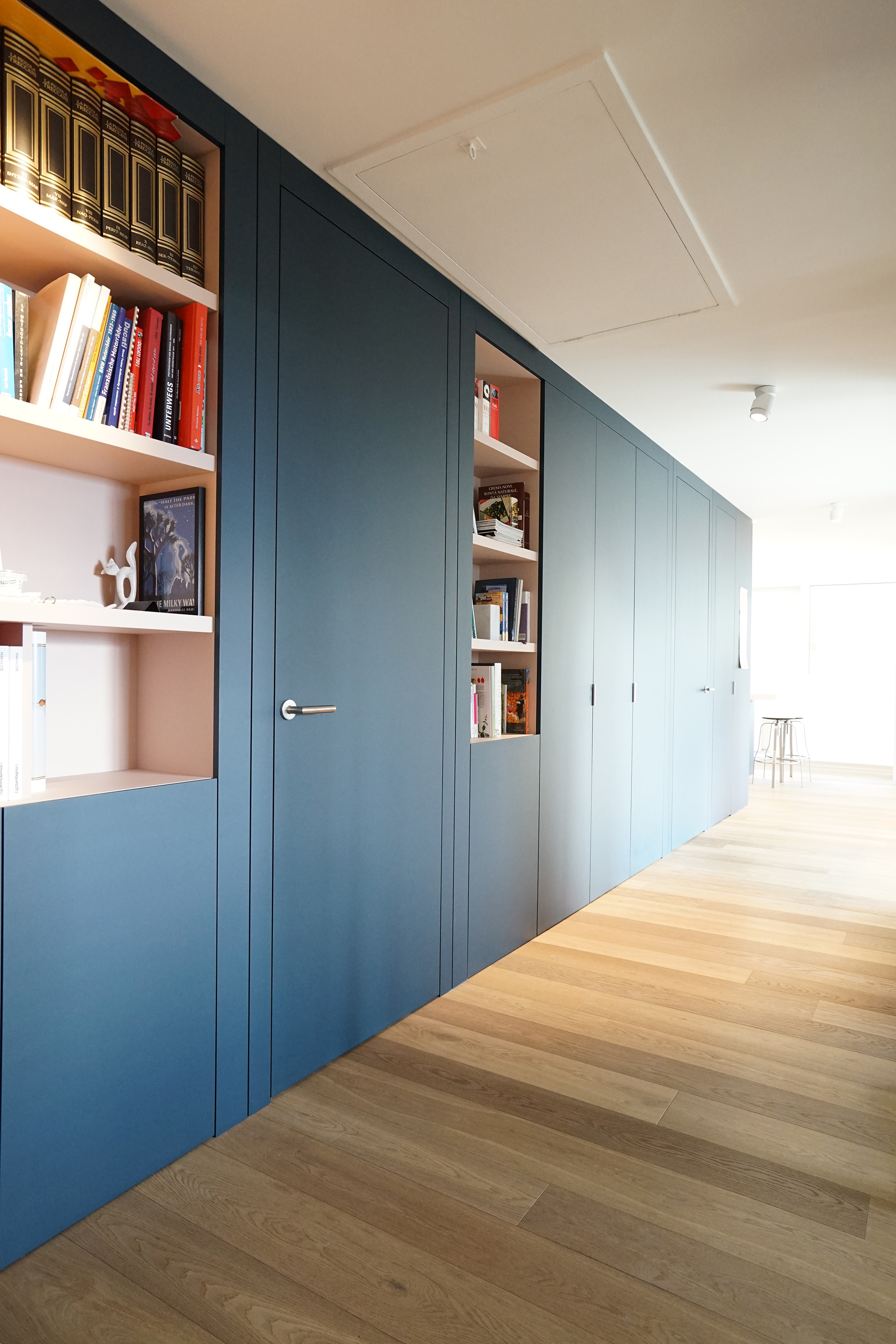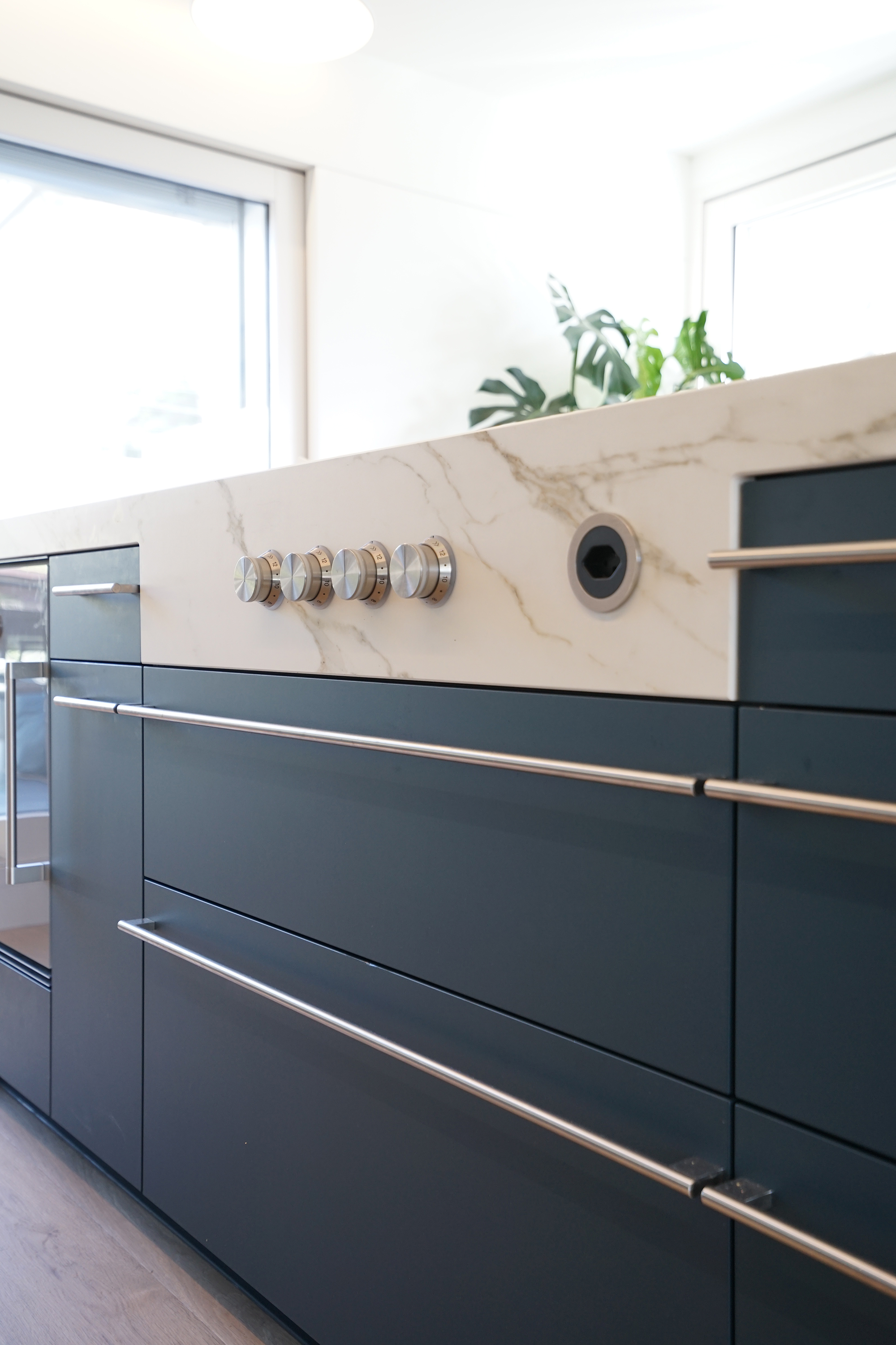 Ausführung von Küche, Entréebereich, Bad, Material: Neolith Estatuario, Strukturlack, Eiche