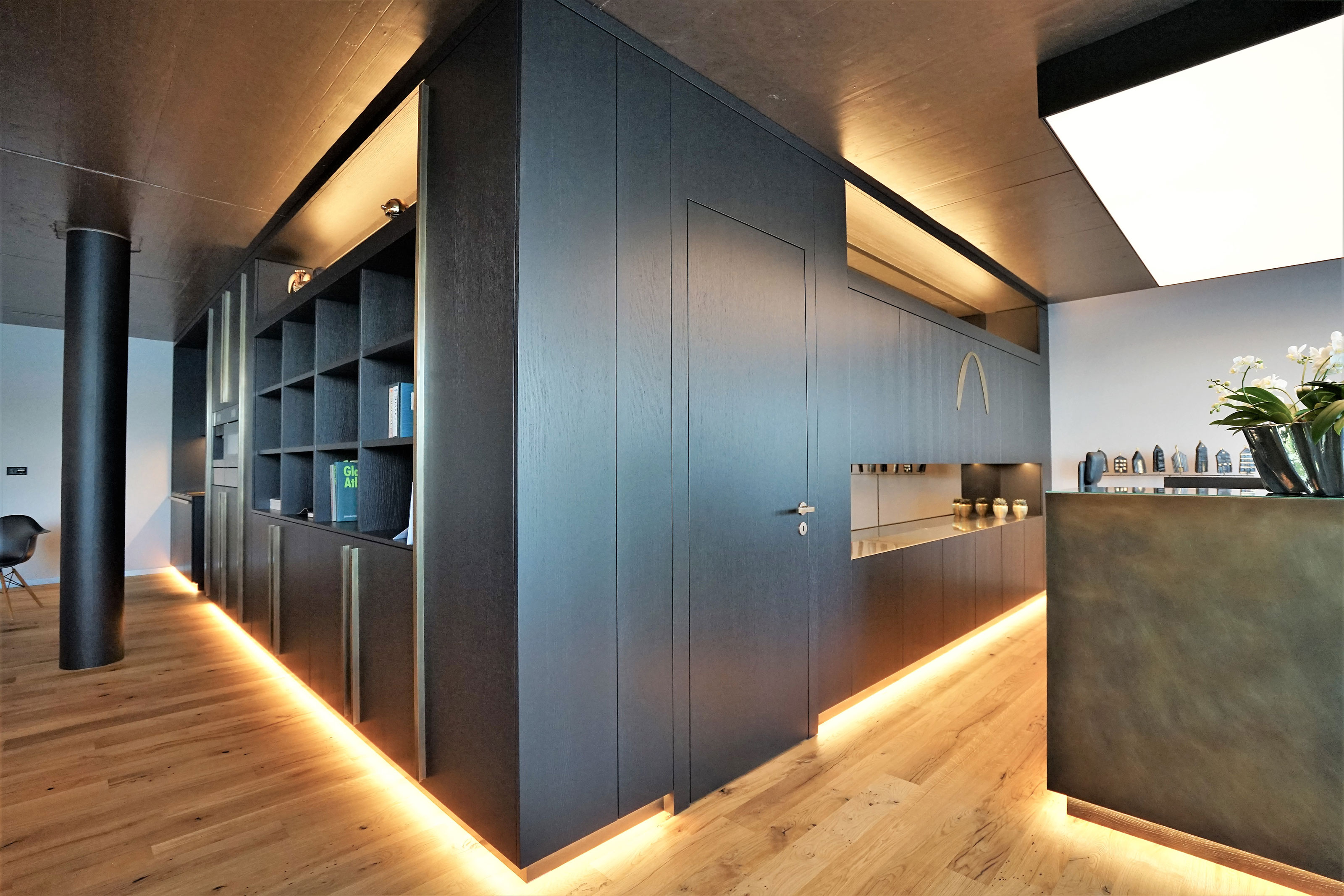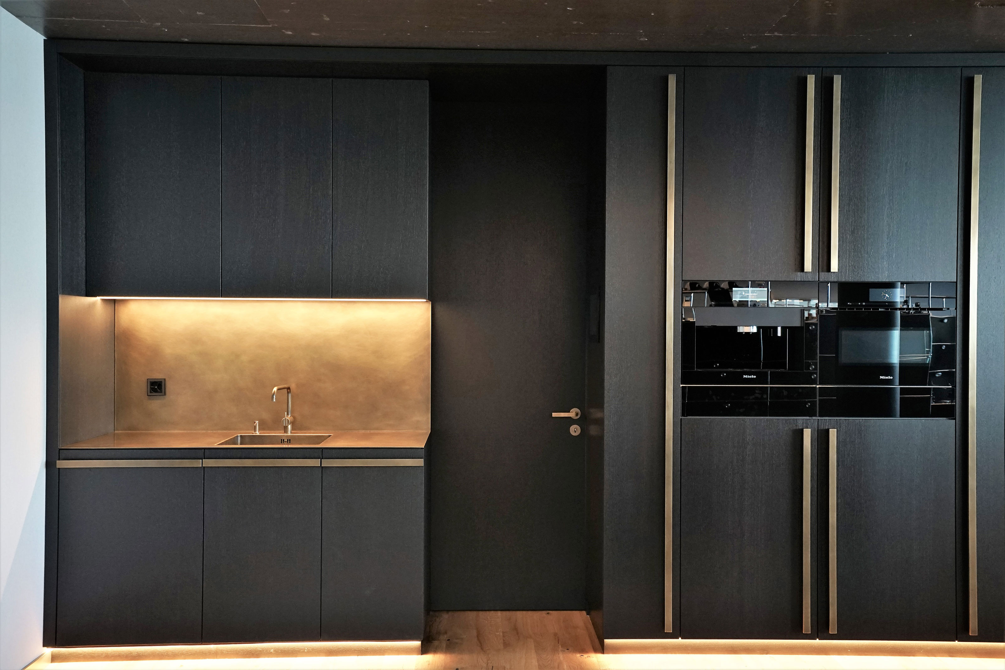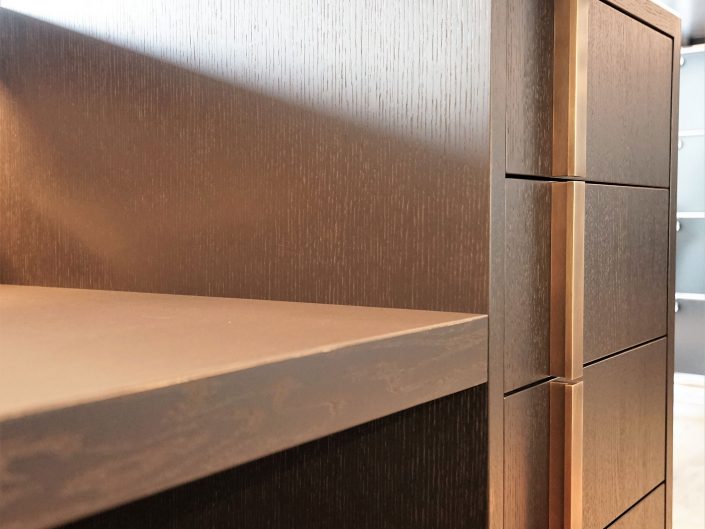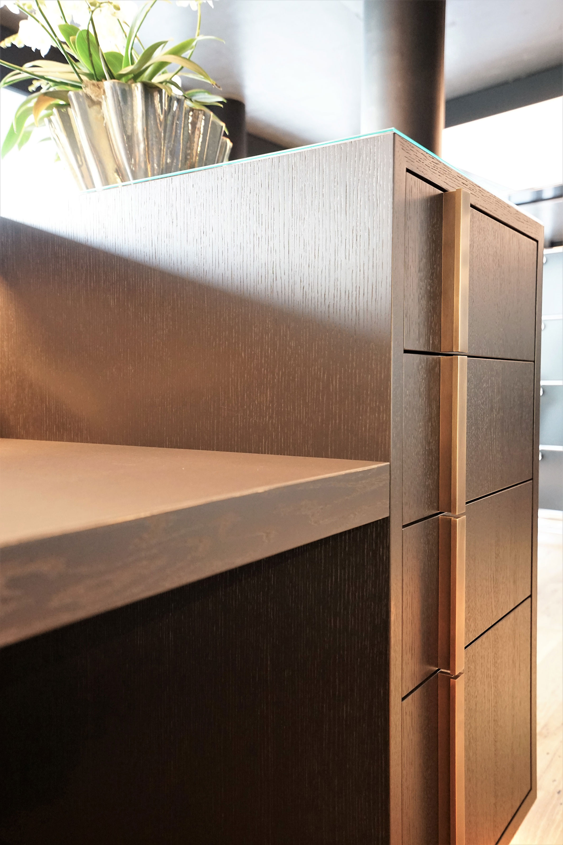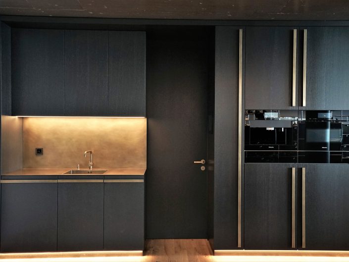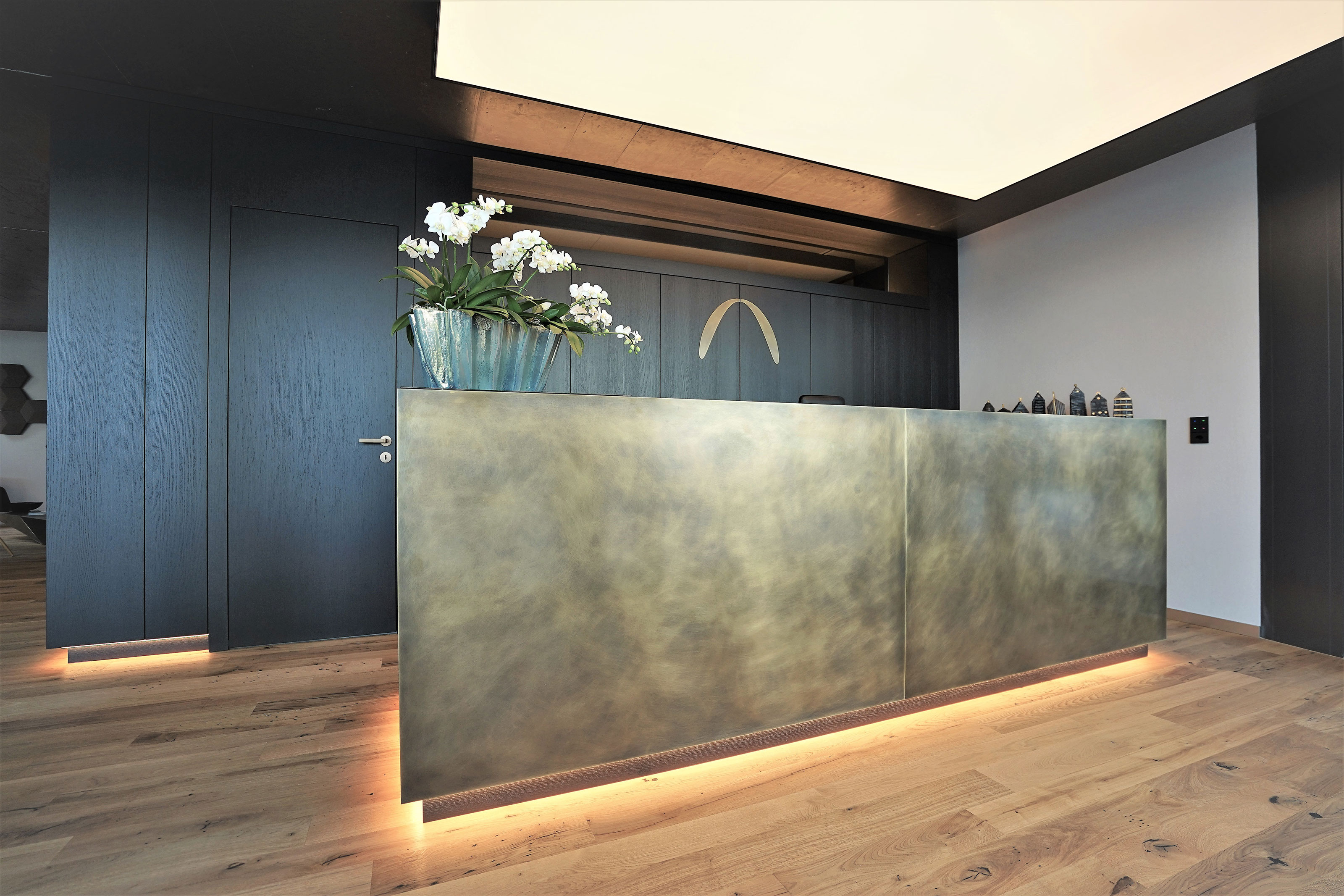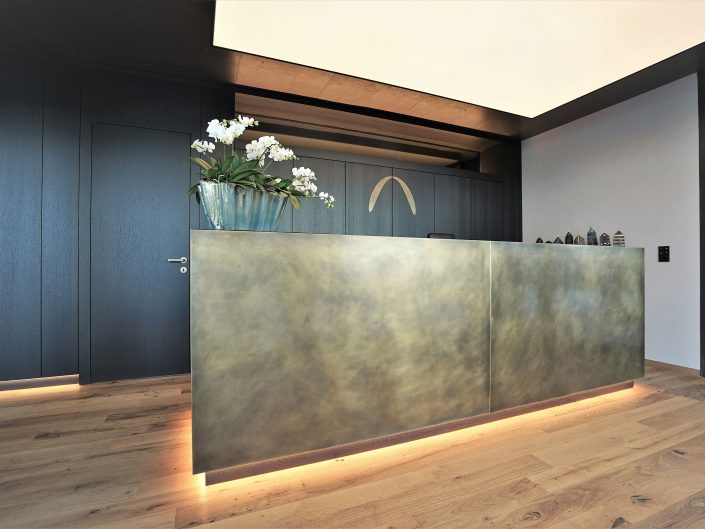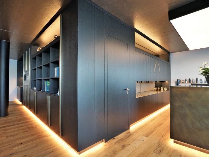 Ausführung von Teeküche, Empfangsbereich, Waschtischmöbel, Sitzungszimmer. Material: Messing brüniert, Eiche wengefarbig gebeizt, Desktop, Spaltleder, integrierte LED Beleuchtung.