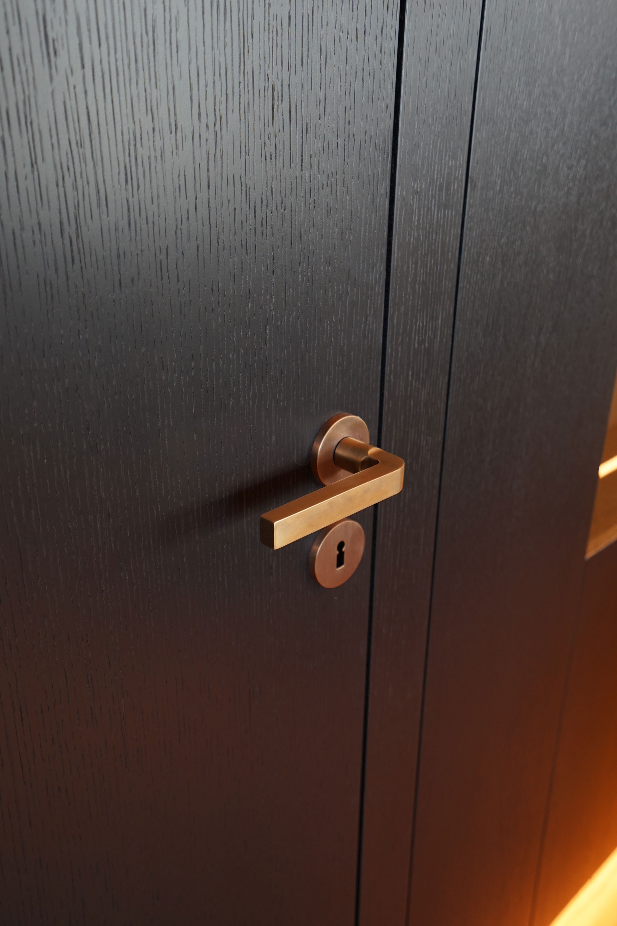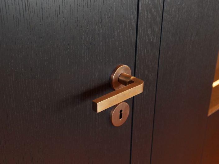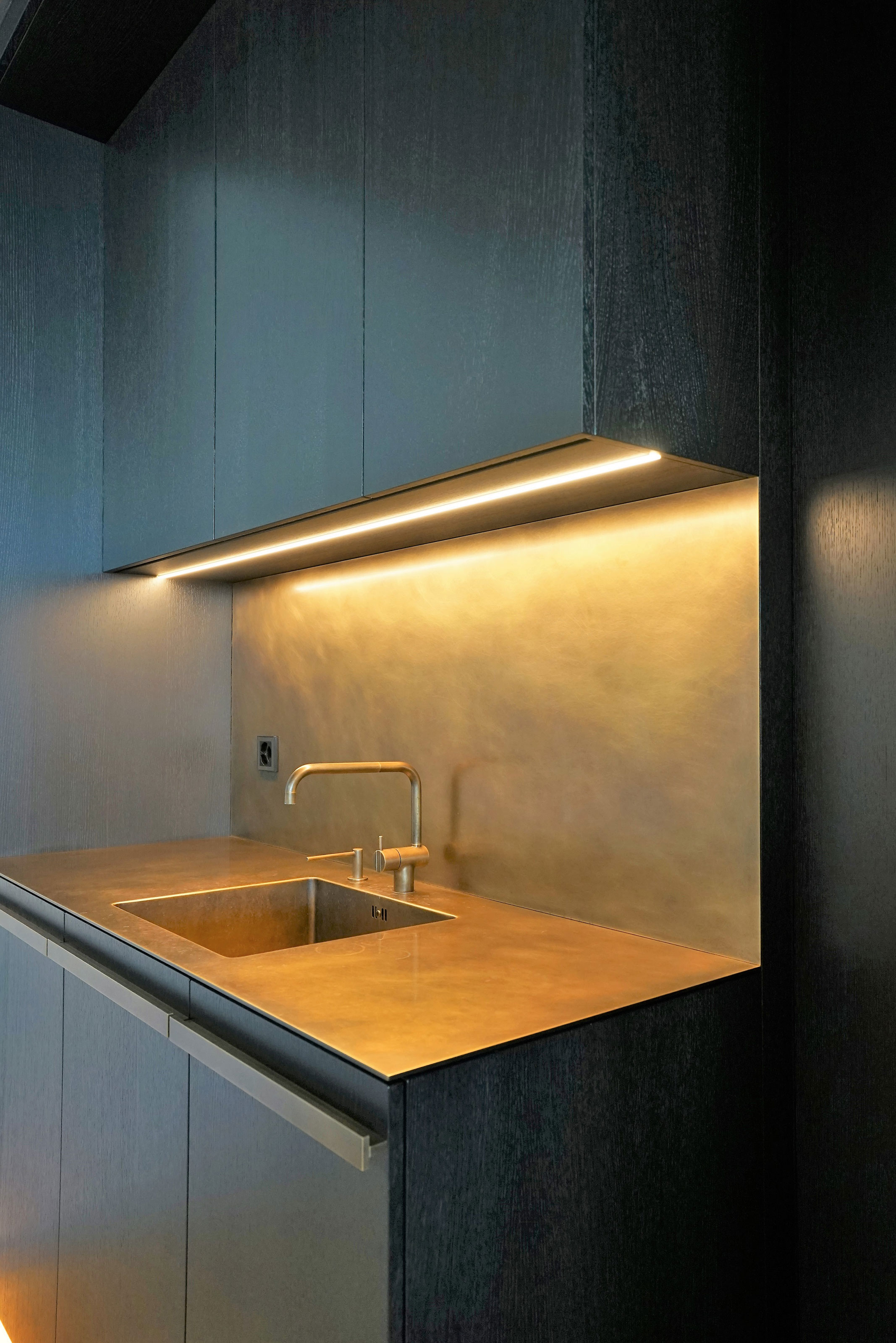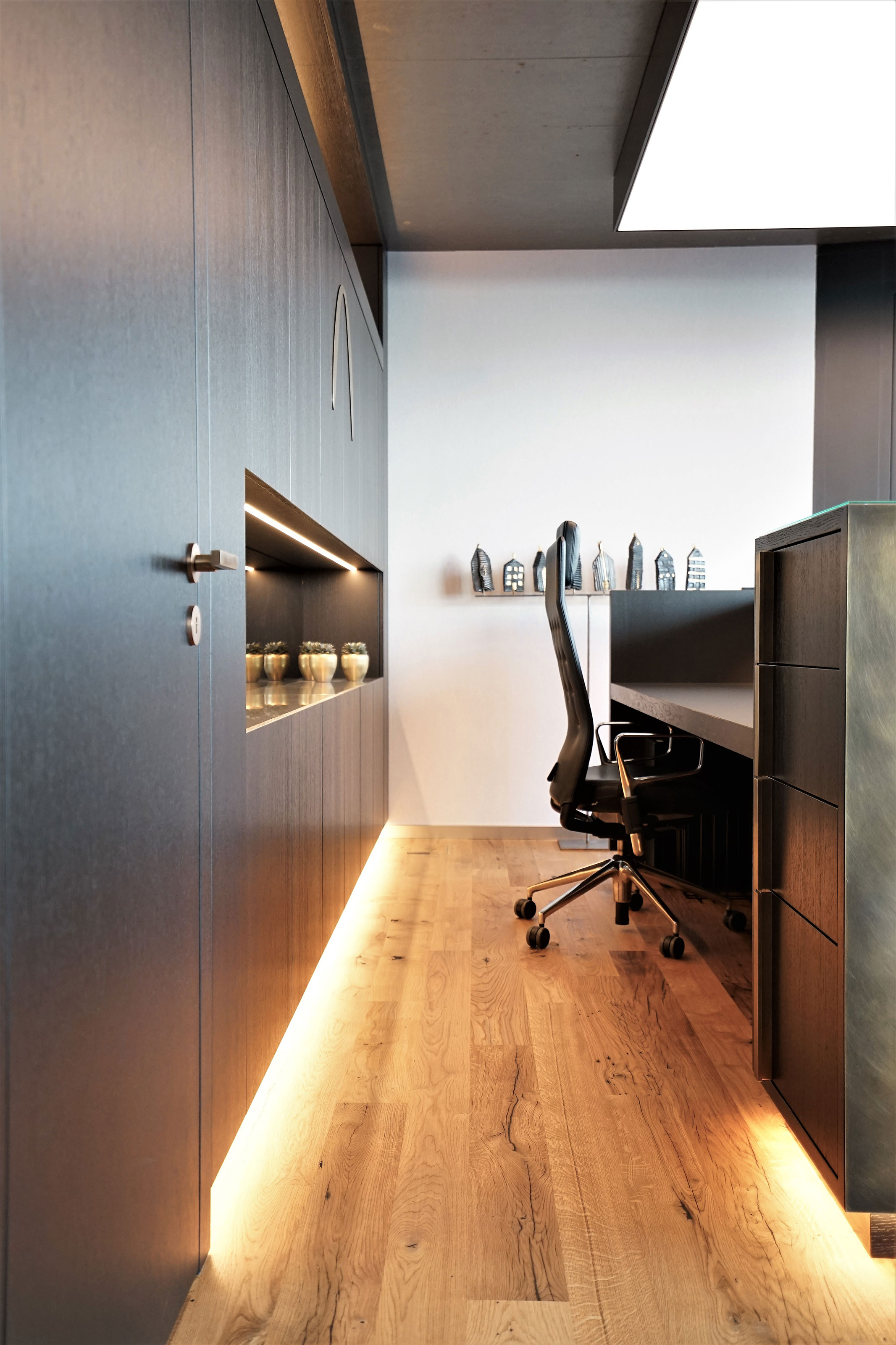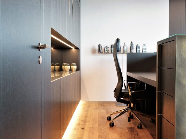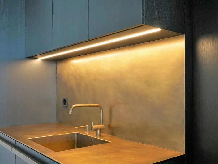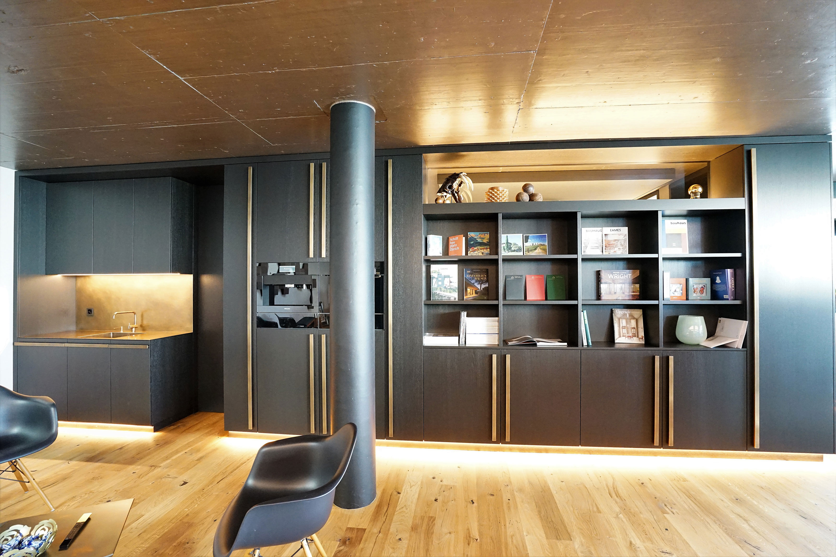 Ausführung von Teeküche, Empfangsbereich, Waschtischmöbel, Sitzungszimmer. Material: Messing brüniert, Eiche wengefarbig gebeizt, Desktop, Spaltleder, integrierte LED Beleuchtung.